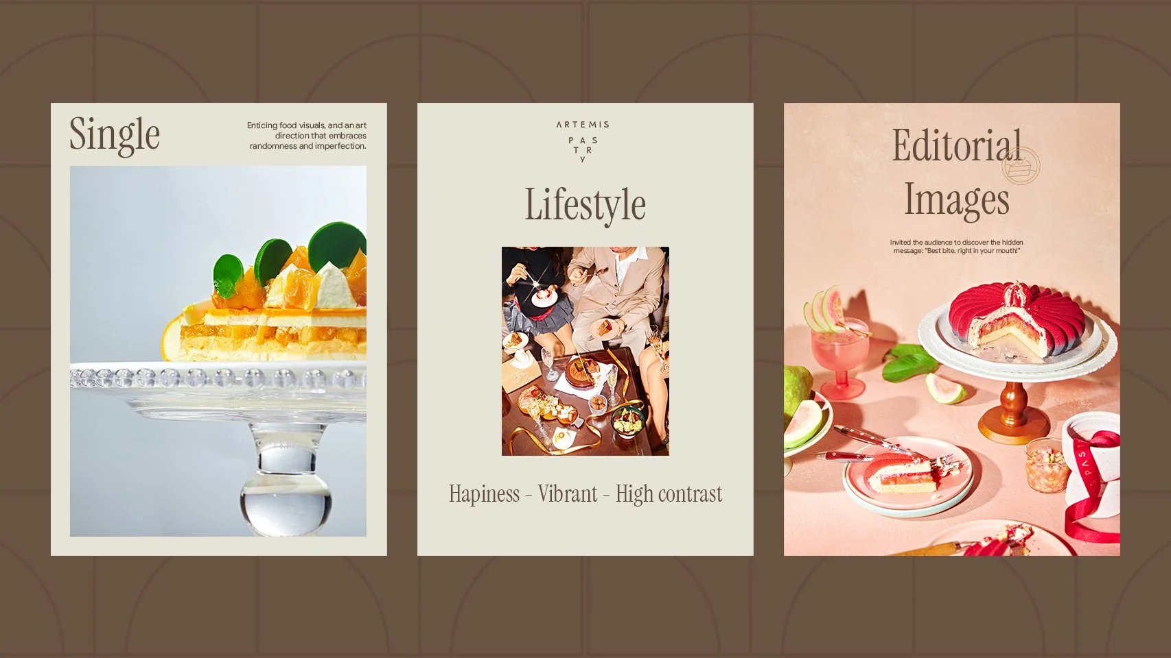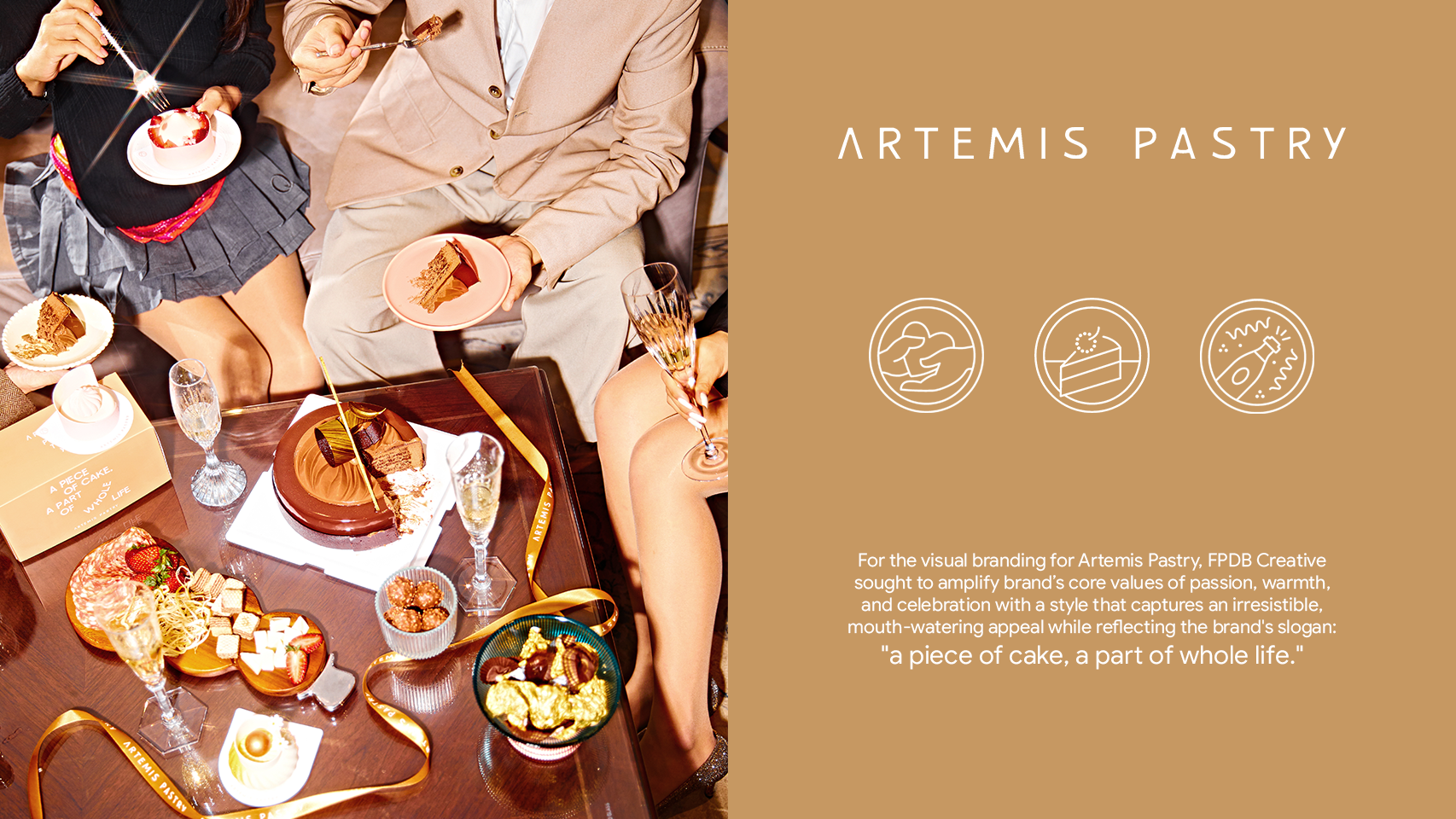 For the visual branding for Artemis Pastry, FPDB Creative sought to amplify brand’s core values of passion, warmth, and celebration with a style that captures an irresistible, mouth-watering appeal while reflecting the brand's slogan: "a piece of cake, a part of whole life."