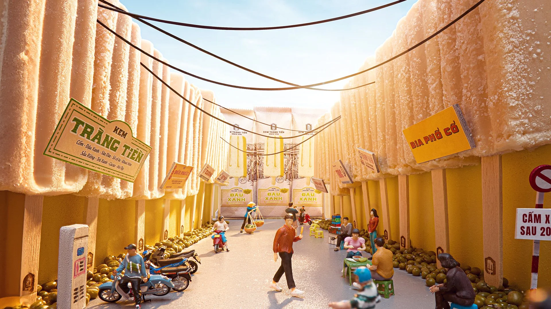 Tràng Tiền Ice Cream and FPDB Creative decided the second direction as the final solution to emphasize closeness, clarity, and heritage. All subsequent executions followed our art direction that highlighted Hanoi's lifestyle, utilized miniatures and a dominant product angle, with a mood and tone that was cozy, familiar, and bright.
