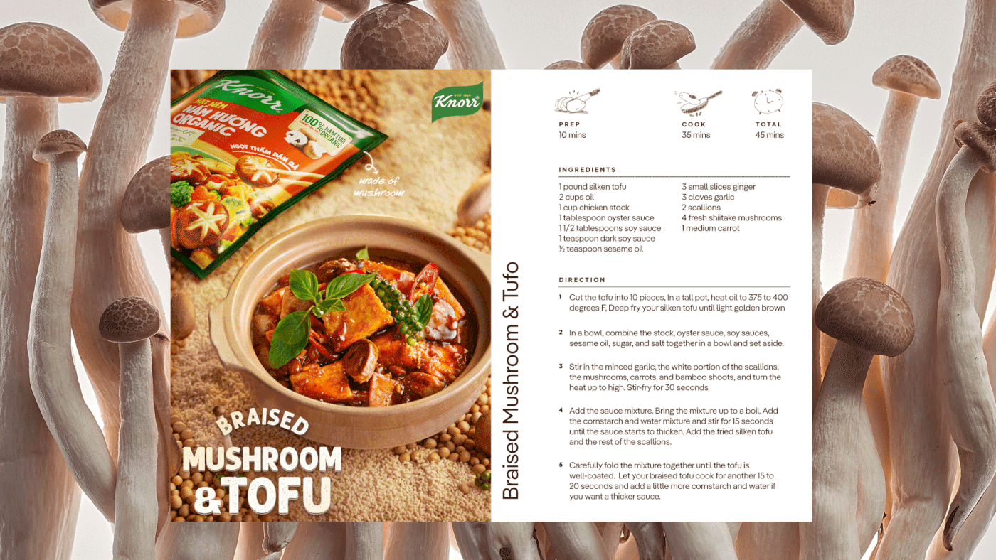 With Vegetarian dishes created by fresh ingredients and Knorr seasoning is the Key Product, Visual of this project must highlight the value of Knorr while showcasing the yummy looking of every dish - a magical world of vegetables creates flavorful vegetarian food surrounding the main dish with the line of Knorr seasoning.