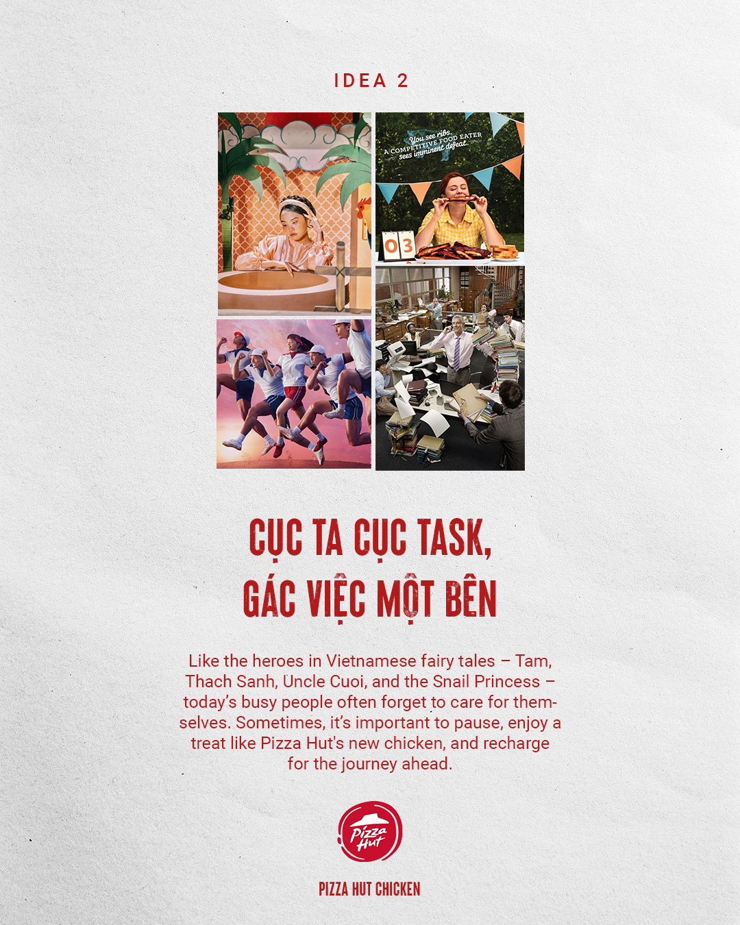 The chosen one was "Cục Ta Cục Task, Gác Việc Một Bên" (Cluck Cluck Cluck, Putting Work Aside), reimagining the classic fairy tale with Tấm and other iconic characters in today’s busy, stressful world. In the past, Tấm was helped by Bụt. But today? Tấm has Pizza Hut's new chicken!