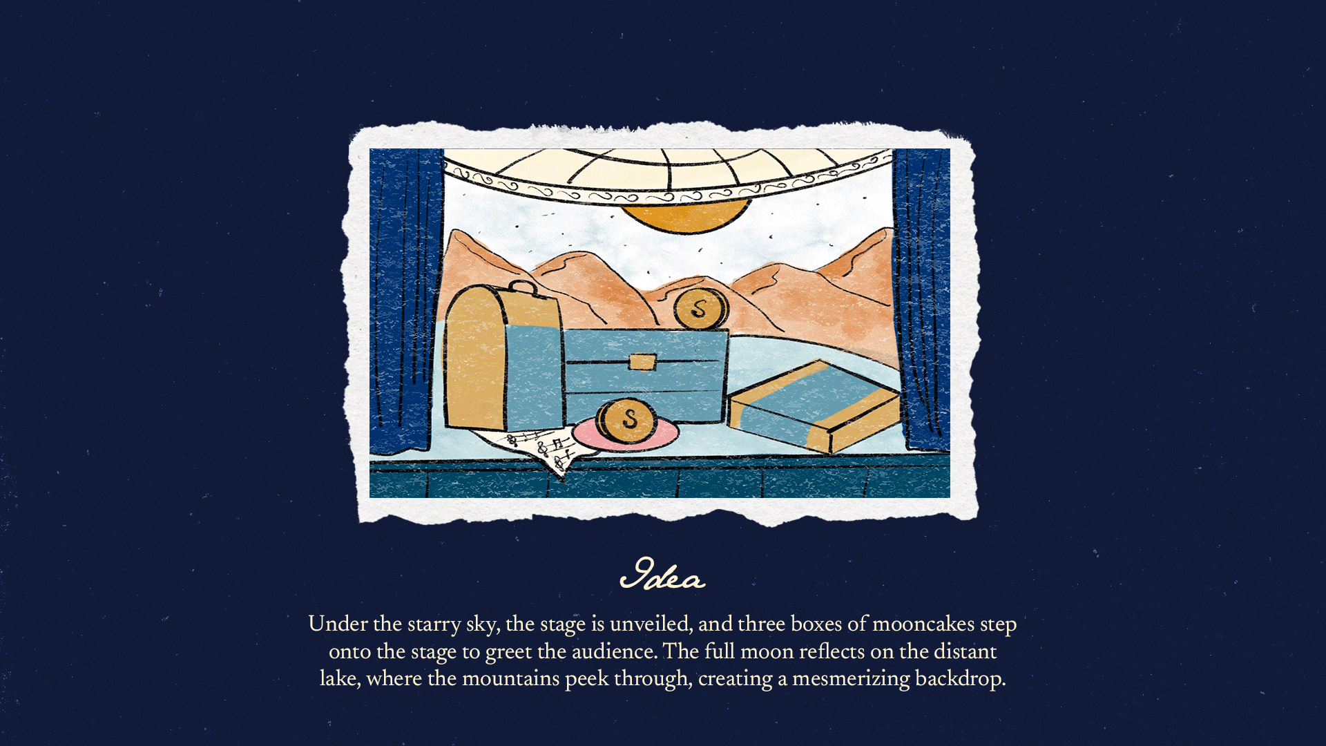 Under the starry sky, the stage is unveiled, and three boxes of mooncakes step onto the stage to greet the audience. The full moon reflects on the distant lake, where the mountains peek through, creating a mesmerizing backdrop.